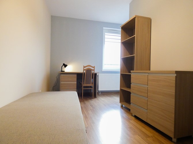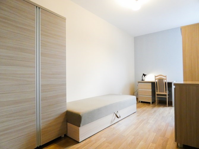 Pokój wyposażony w pojedyncze łóżko, pojemną szafę na ubrania, komodę, biurko oraz szafkę z półkami na książki.