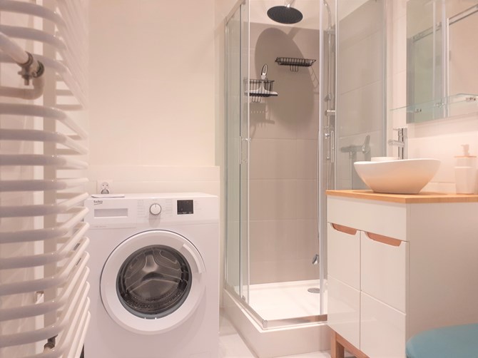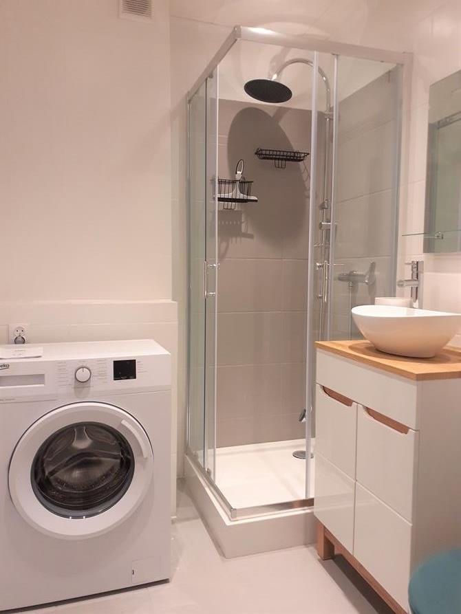 Łazienka: kabina prysznicowa, pralka, umywalka, lustro oraz WC.