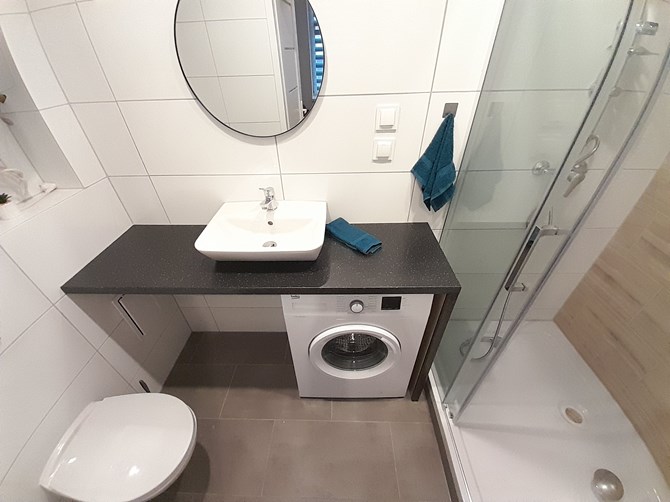 Łazienka: WC, umywalka, prysznic, lustro, pralka