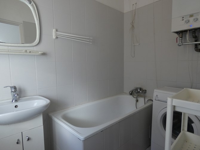 Łazienka: wanna, umywalka, pralka.