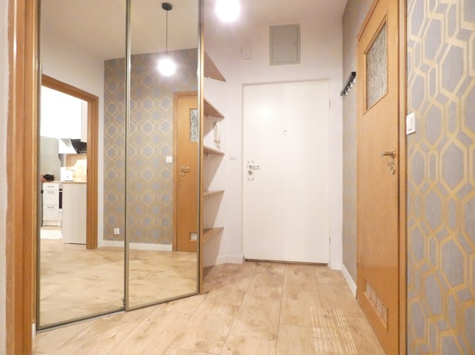 Przedpokój: szafa w zabudowie z lustrem, wieszaki na ubrania.