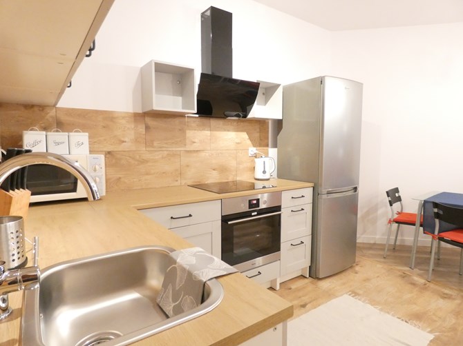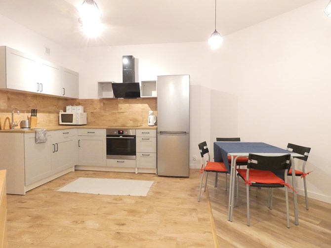 Aneks kuchenny: lodówko-zamrażarka, płyta ceramiczna czteropolowa, piekarnik, kuchenka mikrofalowa, okap z filtrem węglowym, szafki kuchenne, zlew jednokomorowy.