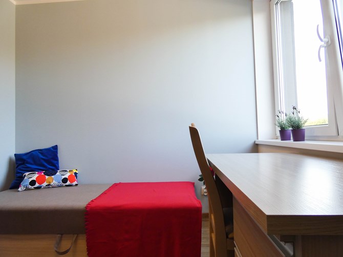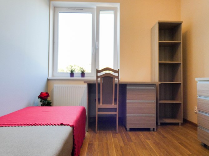 Pokój: pojedyncze łóżko, pojemna szafa na ubrania, komoda, biurko, szafka z półkami na książki.