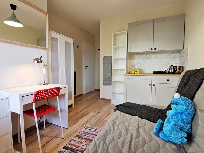 Pokój/mikro studio: rozkładana 2-osobowa kanapa, biurko, krzesło, szafa, aneks kuchenny, łazienka z prysznicem i WC