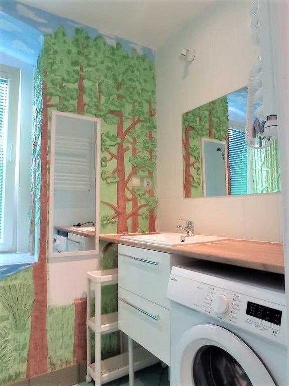 Łazienka z WC: prysznic, pralka, umywalka, szafka, lustro.