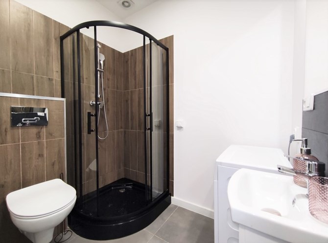 Łazienka razem z WC: umywalka z półką na przybory toaletowe, lustro, kabina prysznicowa, pralka, podtynkowe WC.