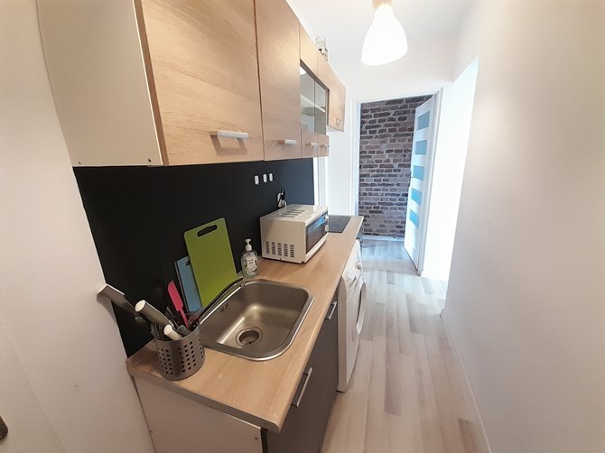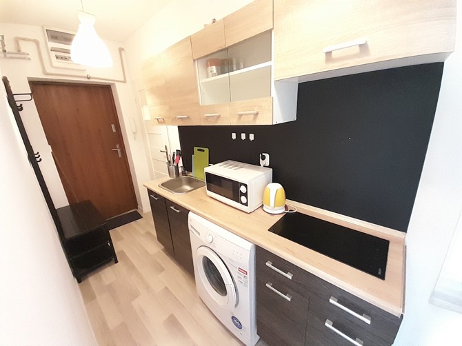 Aneks kuchenny: szafki, płyta elektryczna, mikrofala, lodówka, pralka