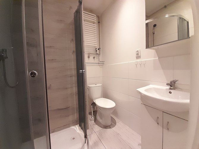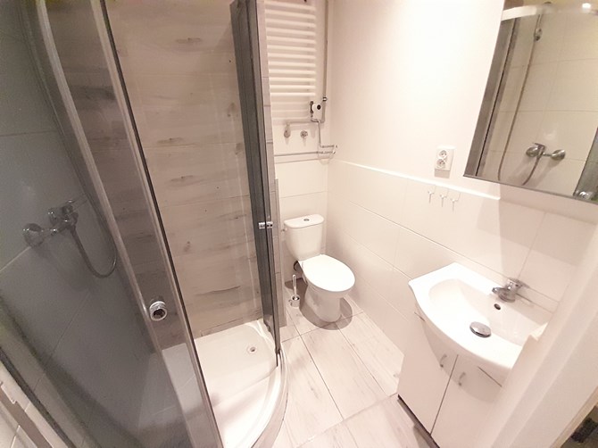 Łazienka z WC: kabina prysznicowa, umywalka, szafka, lustro