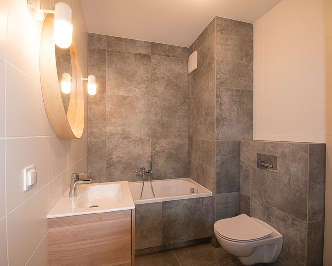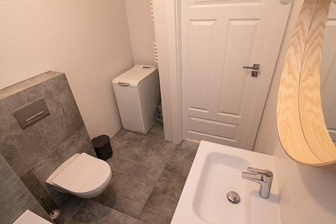 Łazienka: szafka z umywalką, lustro, wanna, WC, pralka.