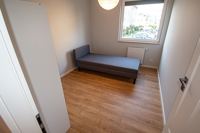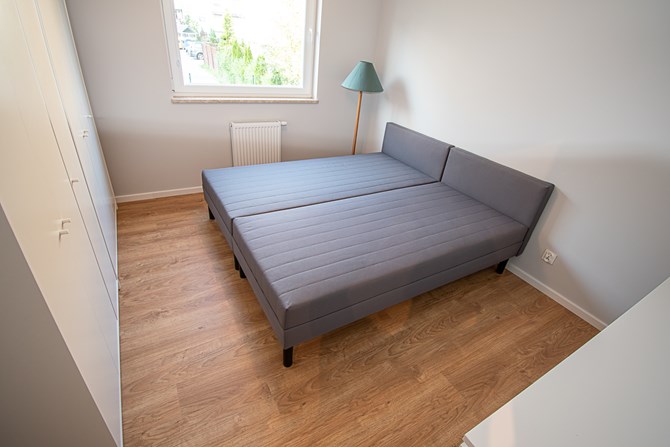 Pokój 2: 2 szafy, 2 łóżka jednoosobowe, komoda, lampa stojąca.