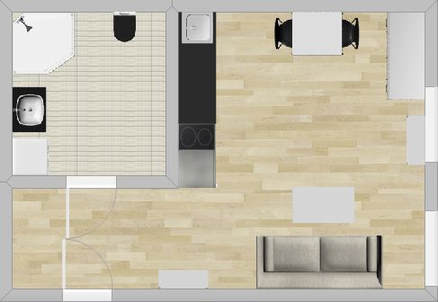 Pokój: rozkładana sofa, stolik kawowy, komoda, regał, stół z 2 krzesłami, komplet mebli kuchennych stojących i wiszących, lodówka, zlew, piekarnik elektryczny, płyta elektryczna 2 polowa, lustro i wieszak.
