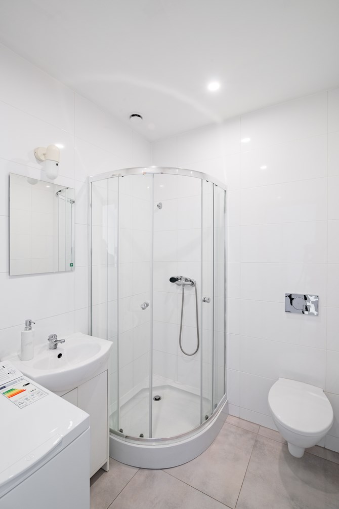 Łazienka: kabina prysznicowa, WC, umywalka i pralka.