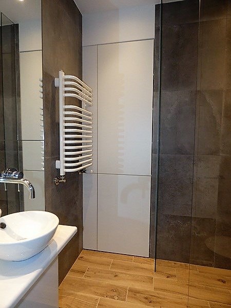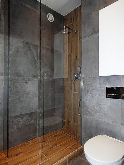 Łazienka z WC: pralka oraz półki (zabudowane w ścianie, dlatego nie widoczne na zdjęciach), umywalka, prysznic oraz deszczownica