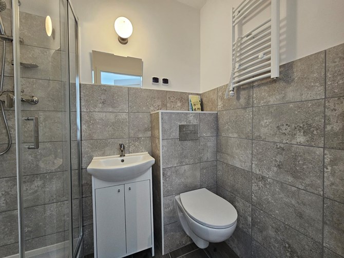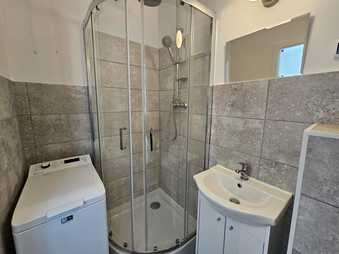 Łazienka wyposażona w kabinę prysznicową, WC, umywalkę oraz pralkę.