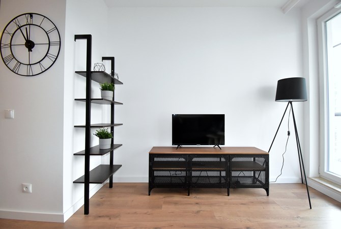 Pokój: kanapa, szafka RTV z TV, stolik kawowy, półki.
