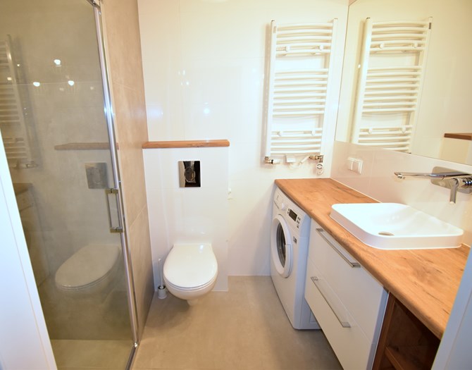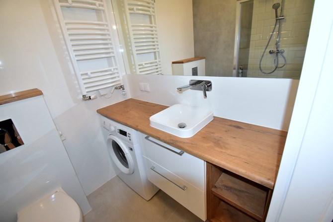 Łazienka razem z WC: lustro, szuflady, prysznic, pralka, umywalka.