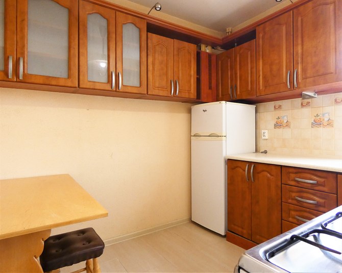 Kuchnia: szafki wiszące i stojące, zlewozmywak, stół, krzesła, piekarnik, czteropalnikowa płyta gazowa, lodówka.