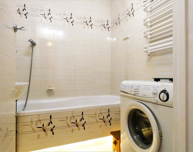 Łazienka: wanna, pralka, umywalka, szafka, lustro.