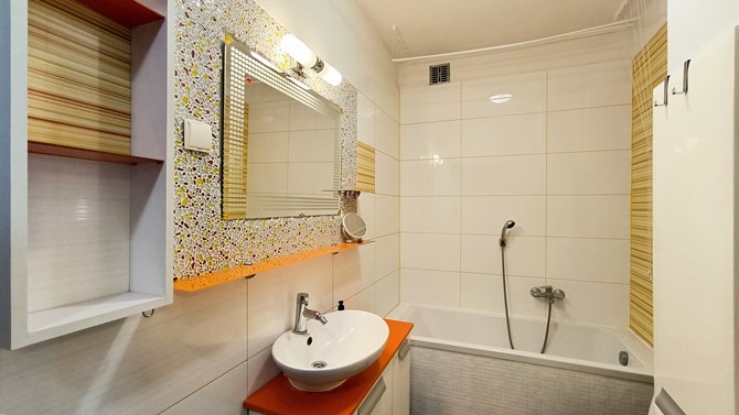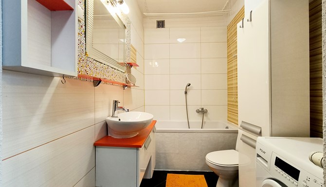 Łazienka: pralka, wanna, umywalka, szafki wiszące i stojące, WC.