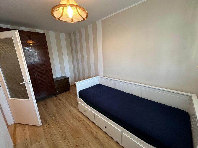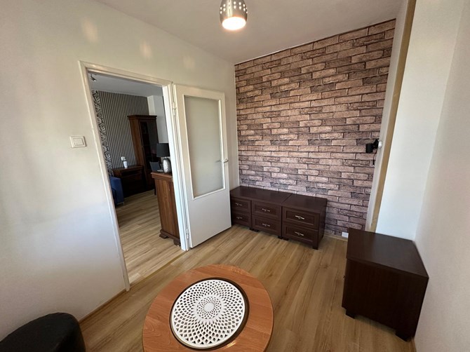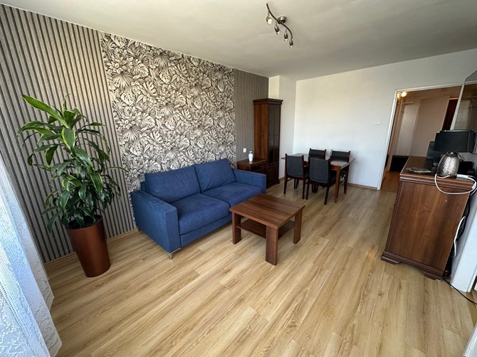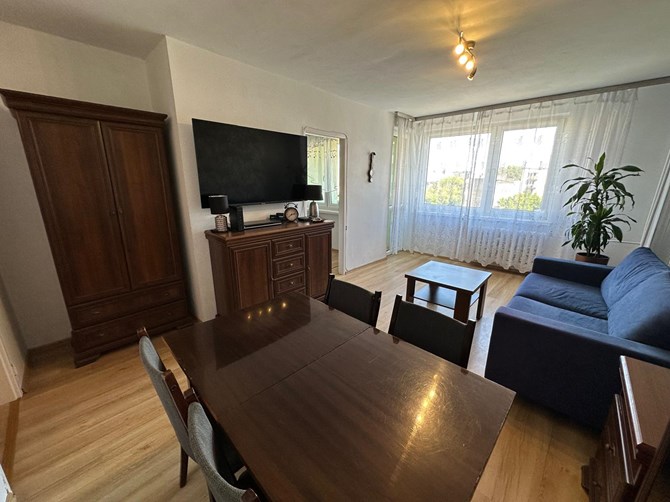 Salon - rozkładana kanapa, TV, stół z 4 krzesłami, szafa, stolik kawowy.
