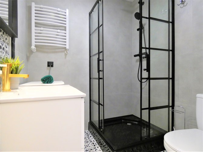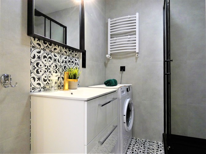 Łazienka: kabina prysznicowa, umywalka z szafką, lustro, pralka.