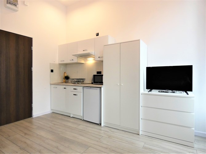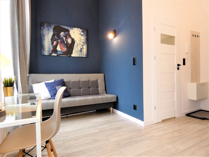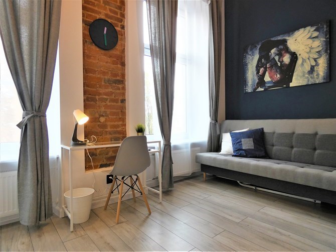 Kawalerka w pełni umeblowana i wyposażona, zlokalizowana w kamienicy z miejskim ogrzewaniem.