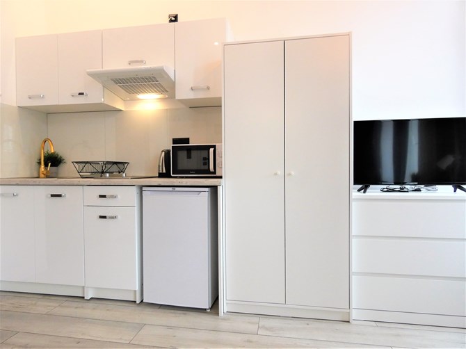 Aneks kuchenny: szafki wiszące i stojące, dwupalnikowa płyta elektryczna, mikrofala, okap, lodówka, czajnik elektryczny.