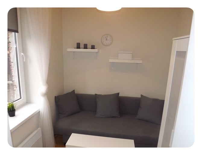 *Pokój: rozkładana kanapa, stolik kawowy, mała komoda i szafa.