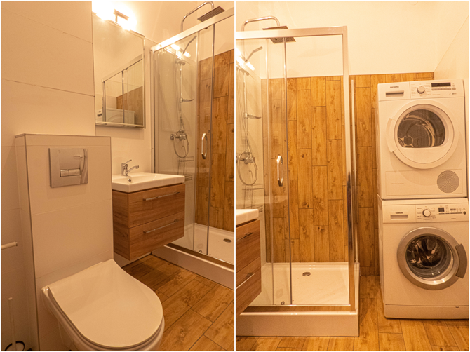 Łazienka: pralka, suszarka automatyczna, kabina prysznicowa, WC, umywalka