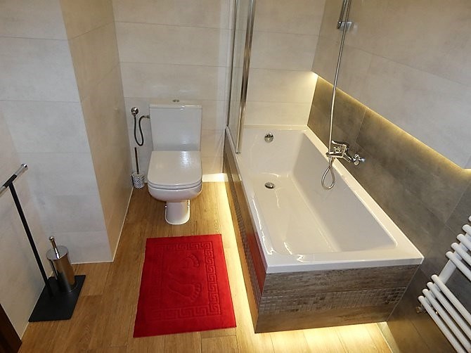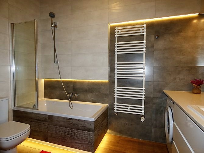 Łazienka (z WC): wanna ze szklanym parawanem, umywalka z szafką, lustro, pralka, WC.