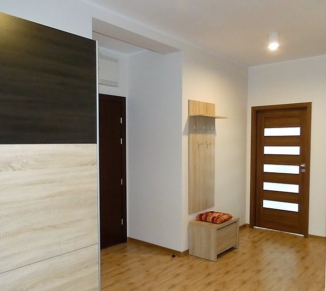 Przedpokój: szafa, szafka na buty, lustro, wideodomofon.