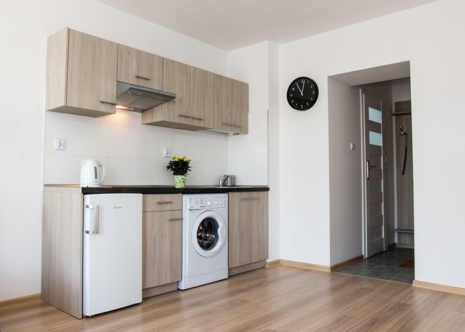 Aneks kuchenny: szafki wiszące i stojące, kuchenka elektryczna, lodówka, pralka.