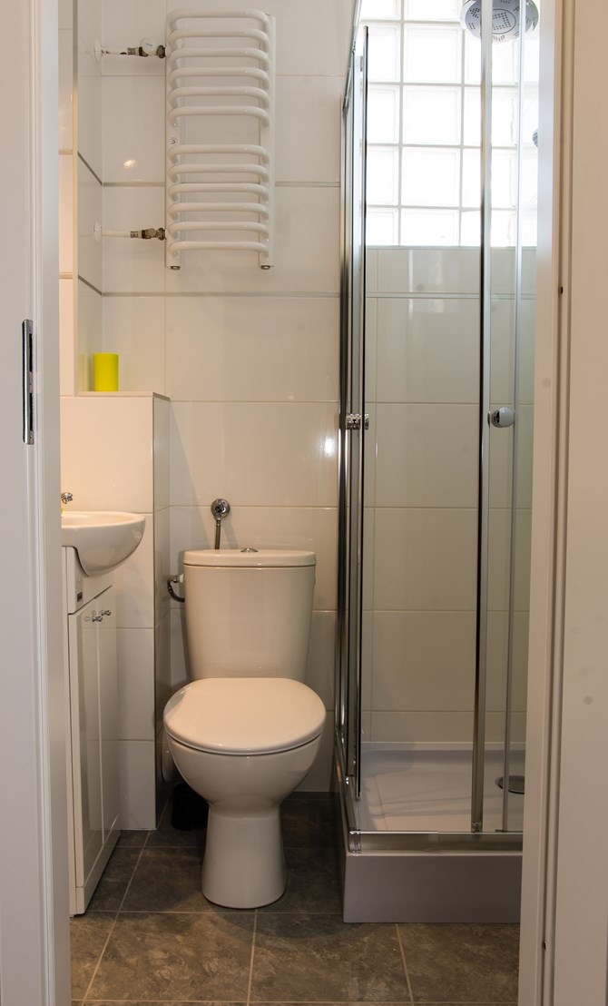 Łazienka: umywalka, WC, kabina prysznicowa.