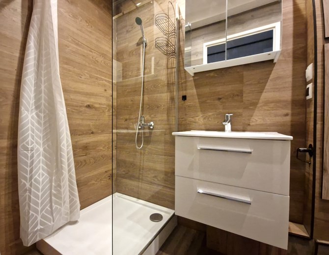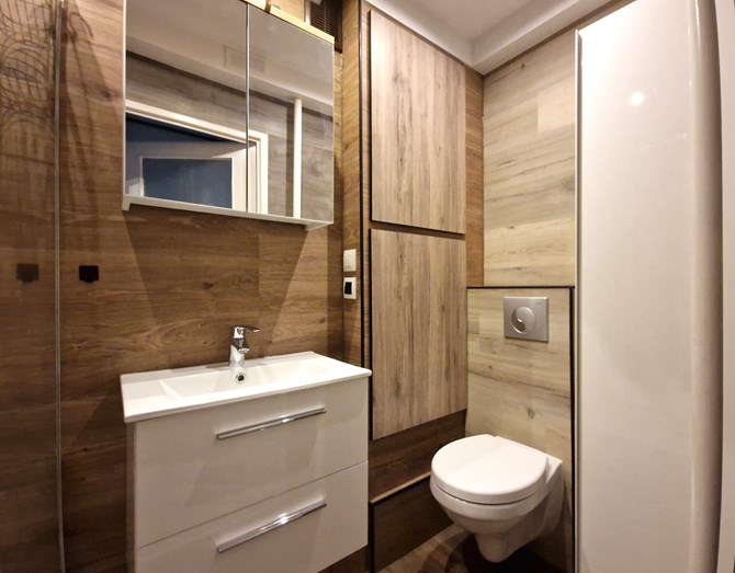 Łazienka (razem z WC): kabina prysznicowa, lustro, szafka, umywalka.