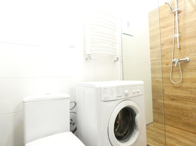 Łazienka: pralka, szafka, prysznic, umywalka, WC.