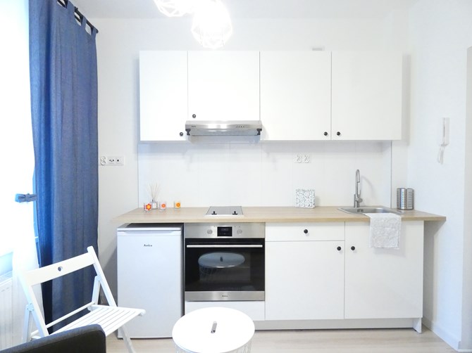 Aneks kuchenny: meble kuchenne stojące i wiszące, zlew, płyta ceramiczna dwupolowa, piekarnik elektryczny, okap /pochłaniacz, lodówko-zamrażarka podblatowa.