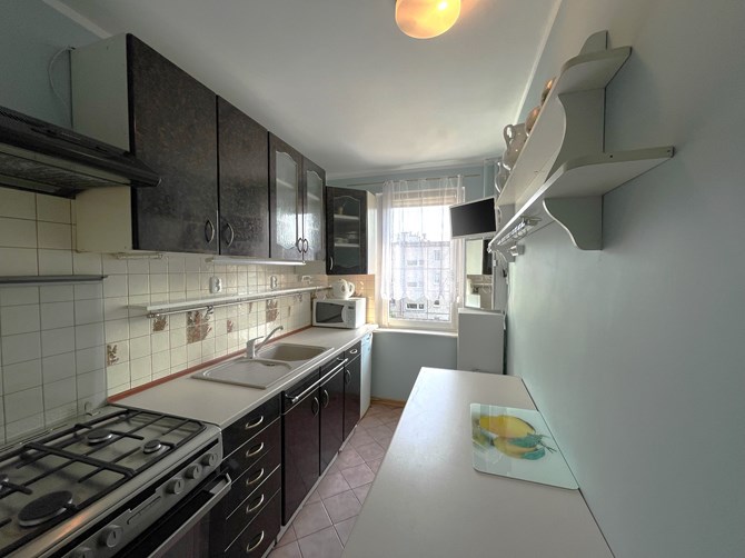 Kuchnia: zabudowa kuchenna, 4-palnikowa płyta gazowa, piekarnik elektryczny, zmywarka, lodówko- zamrażarka, okap, TV, mikrofalówka, drobne AGD.