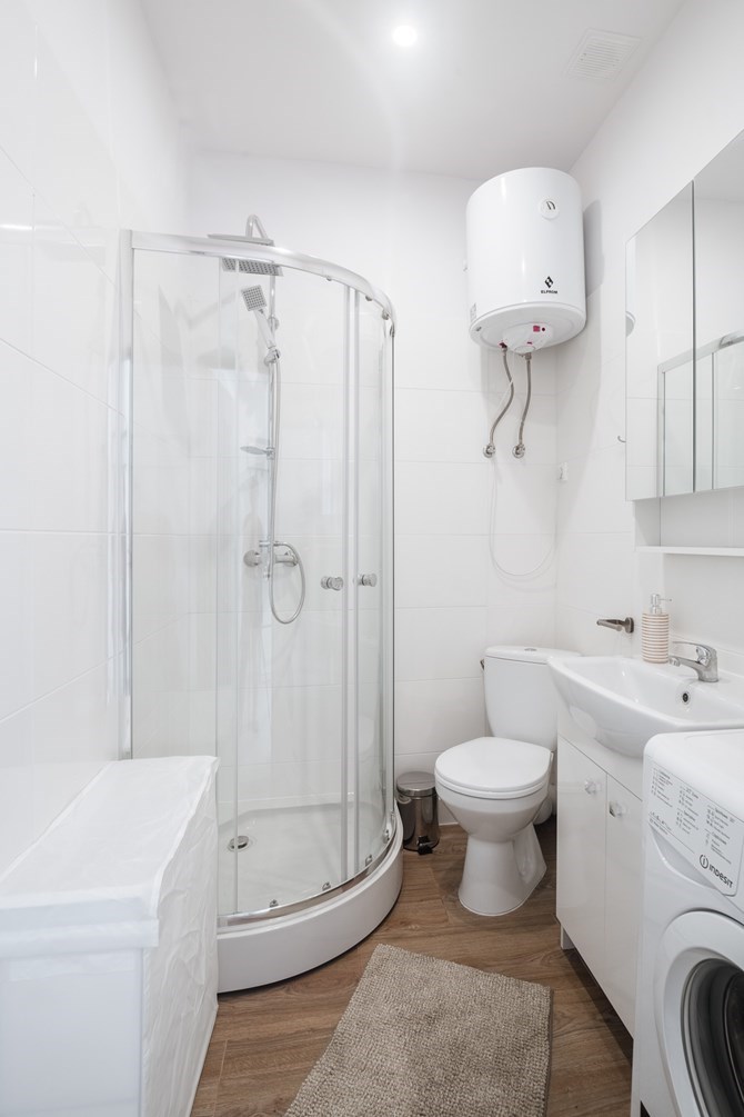 Łazienka razem z WC: lustro, umywalka z szafką, prysznic, pralka