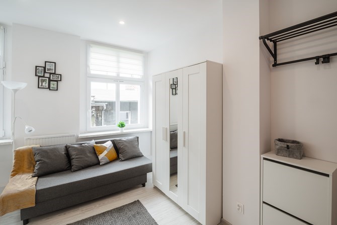 Pokój: rozkładana kanapa, szafa, komoda, stolik do kawy