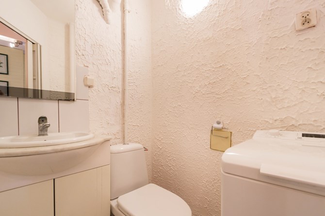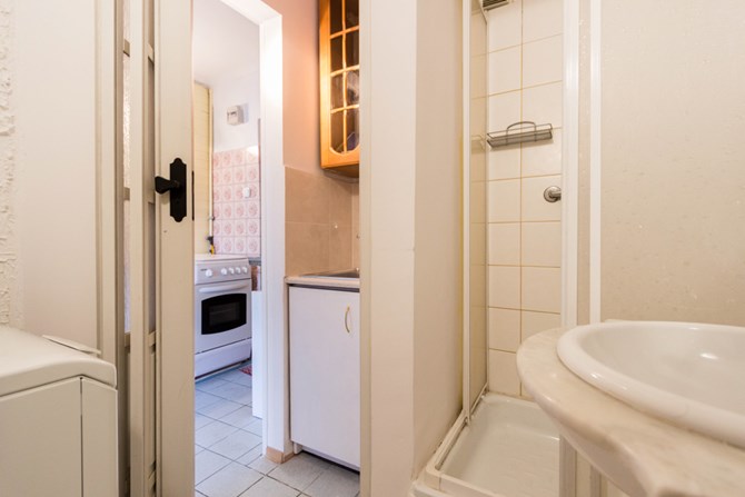 Łazienka: kabina prysznicowa, pralka oraz umywalka.