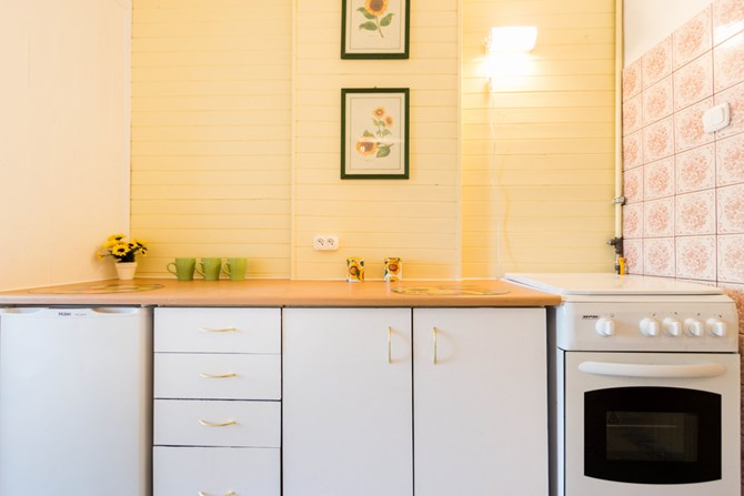 Kuchnia: szafki stojące i wiszące, mała lodówka, kuchenkę gazową z piekarnikiem.