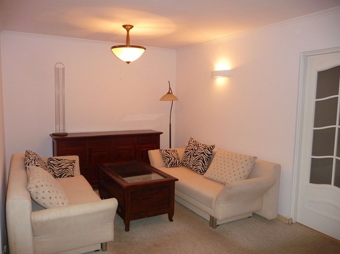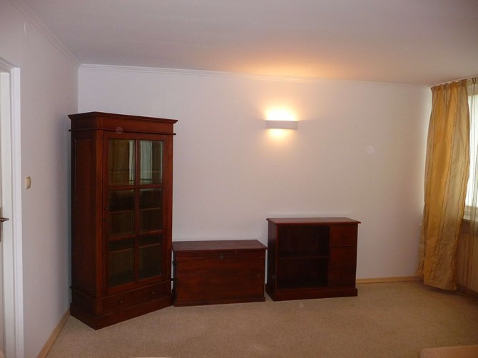 Pokój 1: dwie sofy rozkładane, komoda, szafka, skrzynia, witryna, stół - ława, fotel.