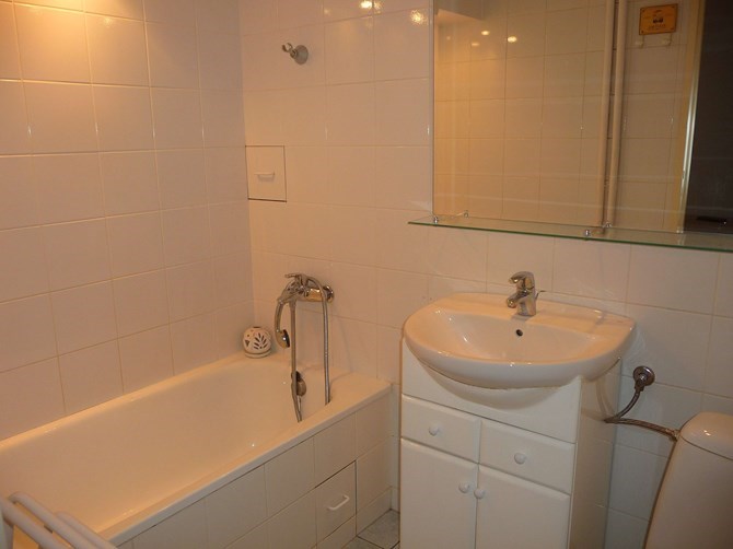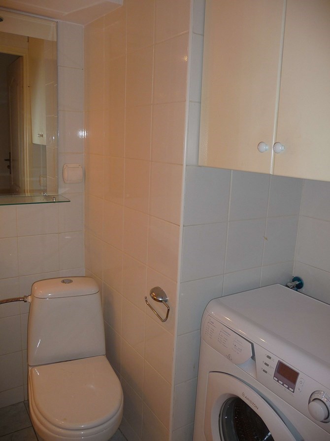 Łazienka z WC: wanna, umywalka, WC kompakt, pralka, szafki.