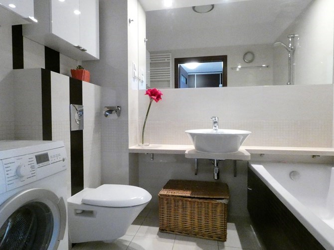 Łazienka: WC, wanna, umywalka, szafka, pralka.