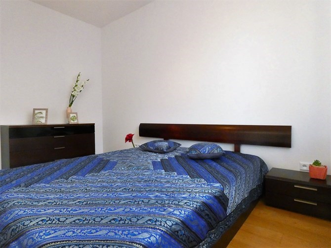 Sypialnia: podwójne łóżko, komoda, szafka nocna, rolety, firanki.