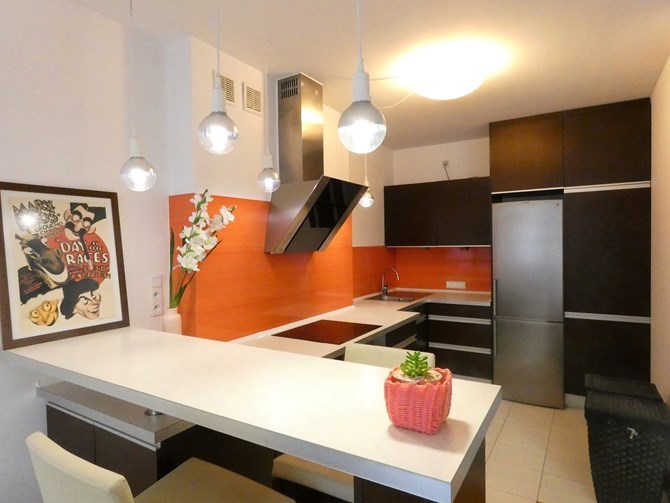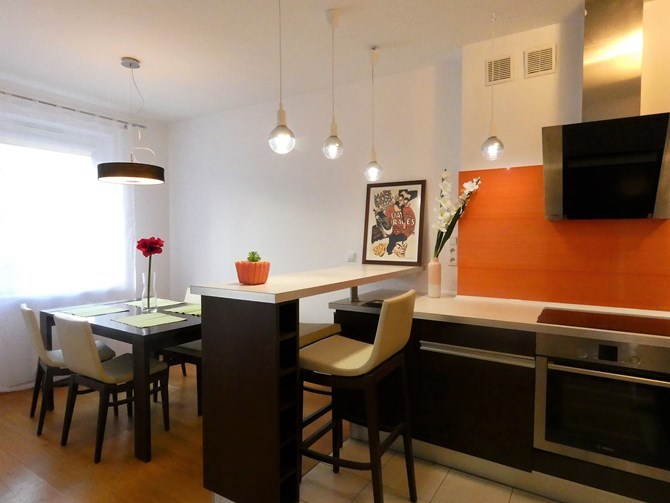 Aneks kuchenny: zmywarka, lodówka, piekarnik, płyta 4-o palnikowa, okap, szafki, bar, duży stół, cztery krzesła.