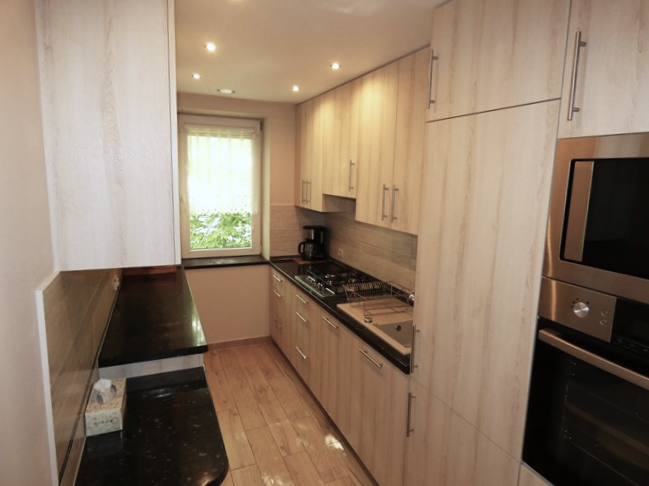 Kuchnia: szafki stojące i wiszące, lodówka, piekarnik elektryczny, zmywarka, ekspres do kawy, mikrofalówka.