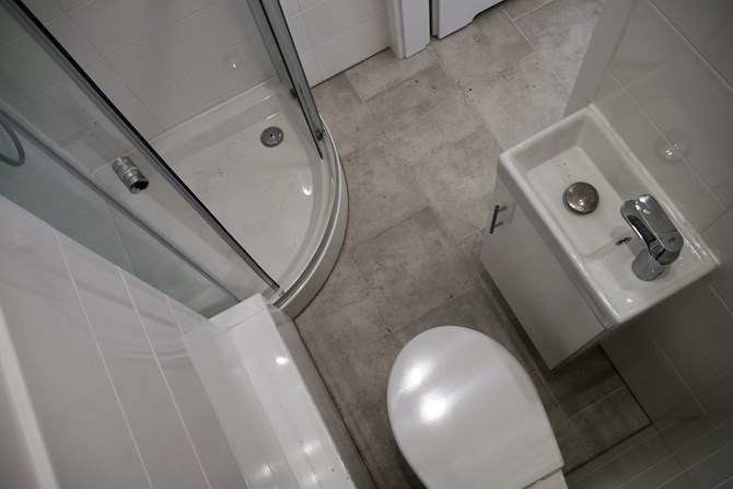 Łazienka 2: kabina prysznicowa, WC, umywalka.