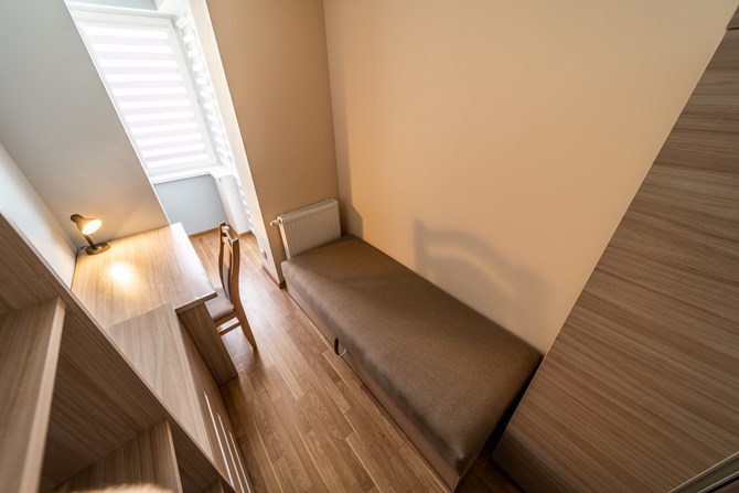Słoneczny, jasny pokój o powierzchni 6 m² z wyjściem na przestronny balkon, położony na 15. piętrze nowoczesnego budynku przy ul. Orlińskiego 1.