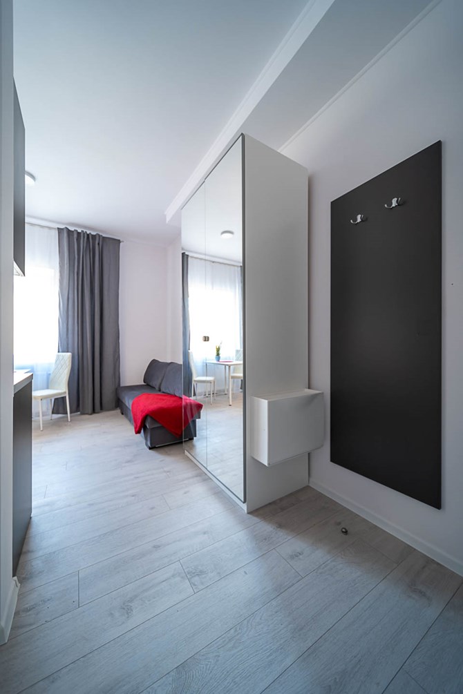 Salon: rozkładana sofa, duża szafa z lustrem oraz stół i 2 krzesła.